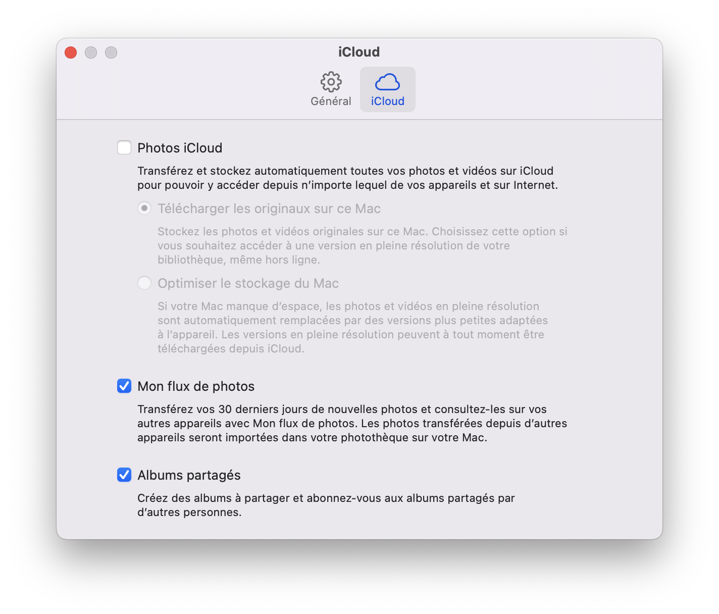 Vous pouvez très bien activer le partage et le flux photos depuis les préférences de Photos, (ses réglages), sans pour autant cocher la case iCloud qui est prévu pour stocker toute votre photothèque sur iCloud.