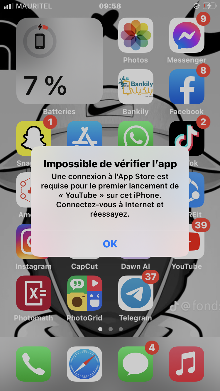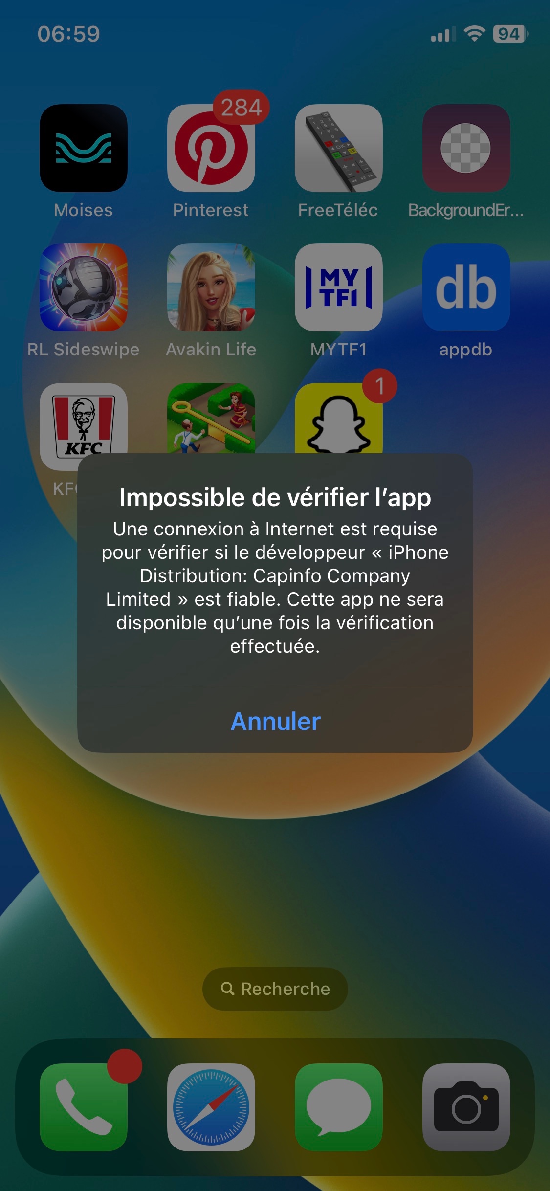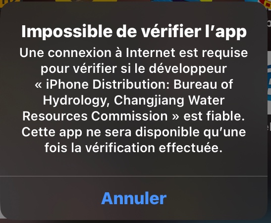 j’ai téléchargé plusieurs apps depuis safaris, je les ai vérifié, et, au début, tout marchait bien. Cependant, environ 1 heure après l’installation et vérification de celles-ci, à chaque fois que je clique dessus, mon iPhone me met le message suivant a l’écran : « Impossible de vérifier l'app. Une connexion à Internet est requise pour vérifier si le développeur « iPhone Distribution: (dans la photo)» est fiable. Cette app ne sera disponible qu'une fois la vérification effectuée. »