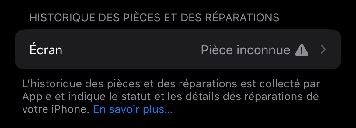 Bonjour, comment je peux faire pour enlever la notification qui apparaît au niveau des réglages car j’ai un iPhone 12 reconditionné il fonctionne bien pas de souci mais l’écran me marque pièce inconnue j’imagine bien que ce n’est pas du Apple… Si quelqu’un sait merci à vous