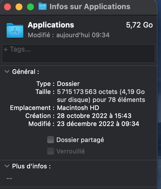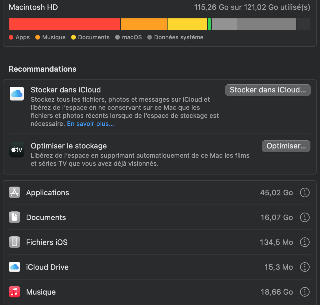 Jusqu'a maintenant j'avais environ 5Go d'application sauf que depuis quelques jours j'ai 45Go alors que je n'ai pas installé de nouvelles applications. Et lorsque que je vais pour optimiser l'espace, je ne trouve aucune application expliquant les 45Go. Les informations du dossier Application n'indique que 5Go utilisés.