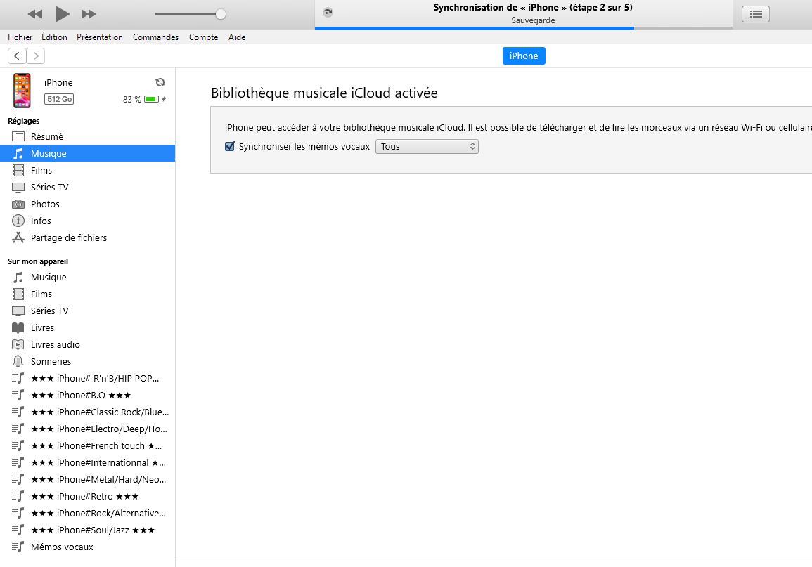Quand, je vais dans l'onglet réglage puis musique pour les synchronisés habituellement il y a le choix de sélectionné les différentes playlists que j'ai créé et la il reste plus que l'intitulé...bibliothéque musicale activé!!!