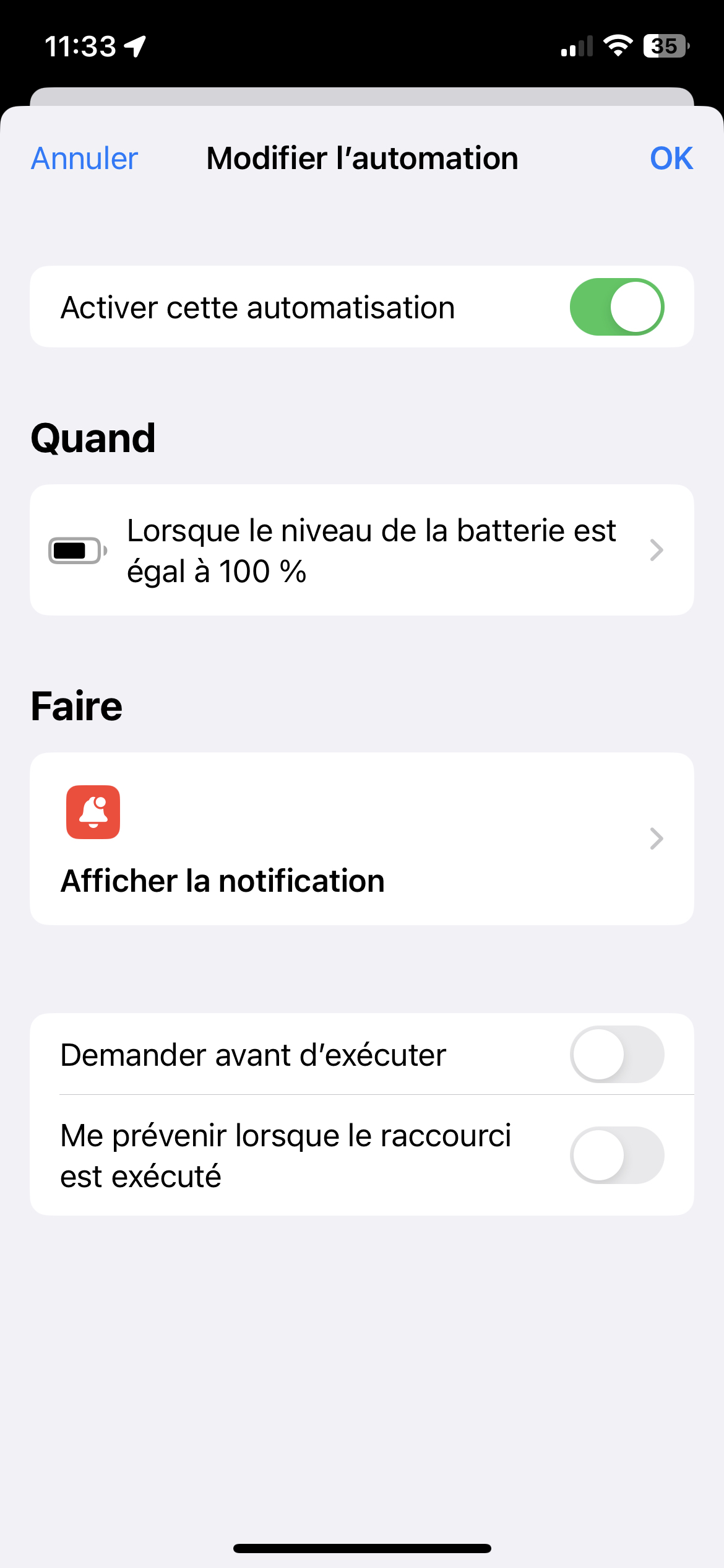 Je viens de la mettre en place, je vais voir ce que ça donne lorsque mon iPhone sera chargé de mon côté. Normalement, cette automatisation devrait créer une notification lorsque l'iPhone est chargé. Comme ton iPhone sera en veille et en charge, cette notification est censée venir sur ton Apple Watch.