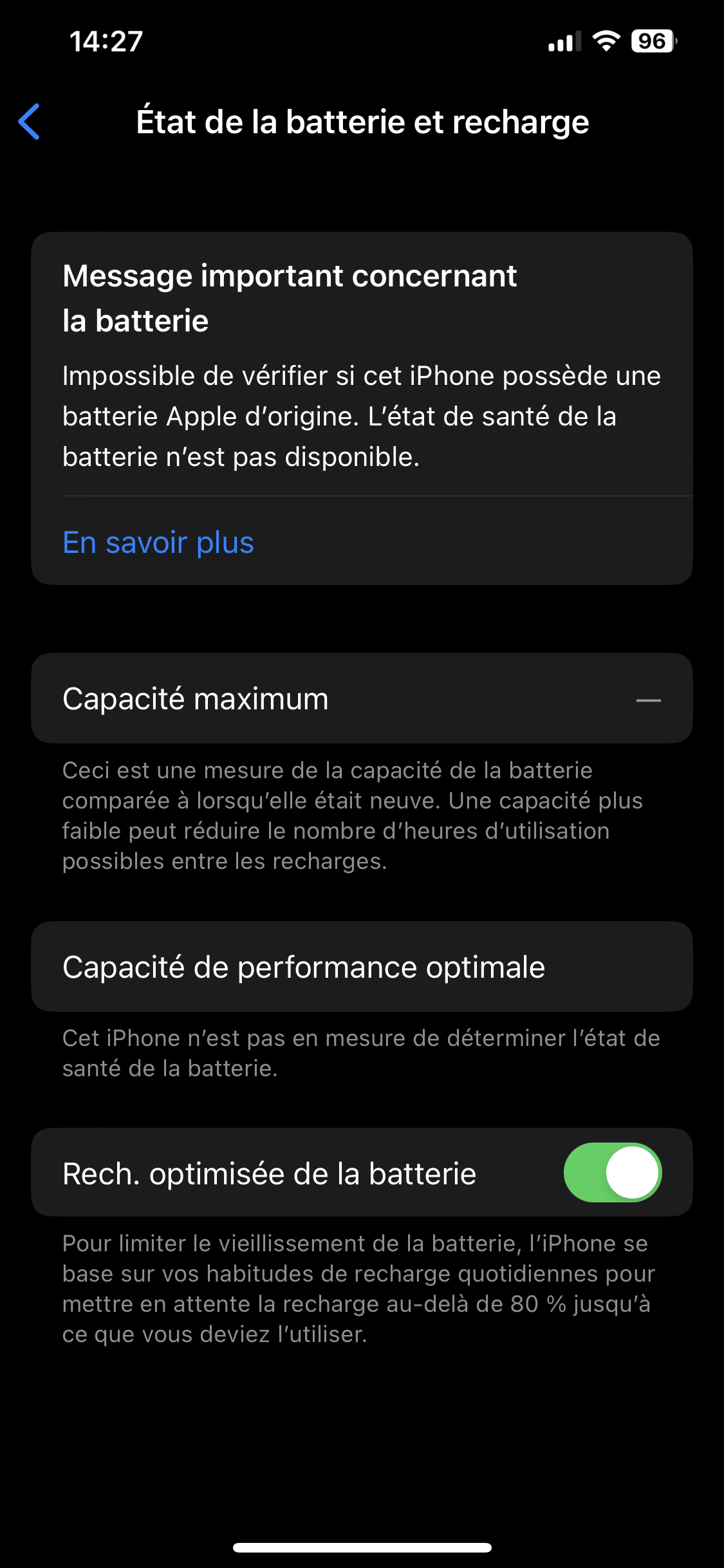 Il vous faut vous rendre en Apple Store ou centre de service agrée Apple pour faire changer votre batterie par une originale Apple. Ce message indique que la batterie a été changée hors du circuit officiel Apple avec une batterie compatible.