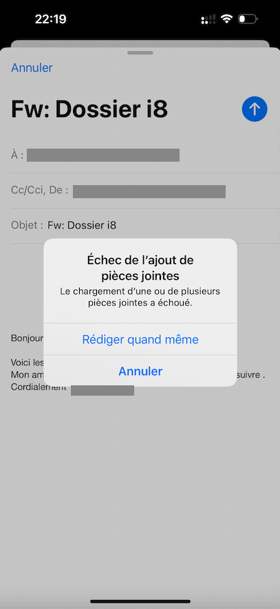 Problème envoi et transfert mails avec pièce jointe iPhone