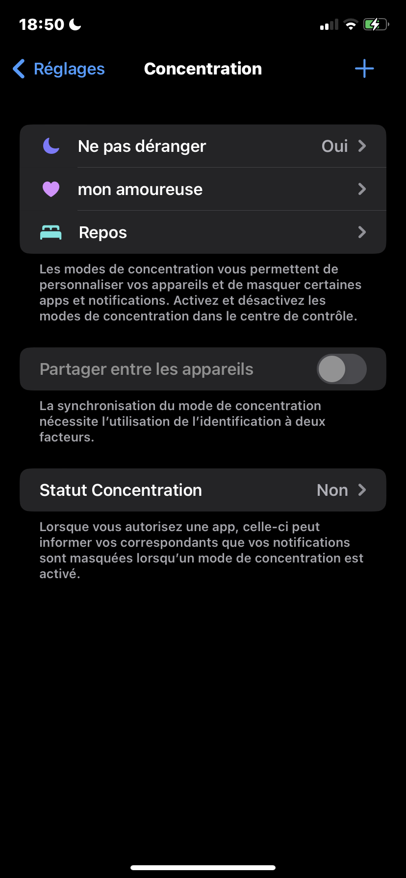 Il est indiqué que vous devez activer l'authentification à deux facteurs pour utiliser le partage du mode de concentration.