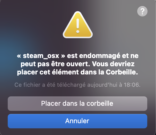 « steam_osx » est endommagé et ne peut pas être ouvert. Vous devriez placer cet élément dans la Corbeille.
