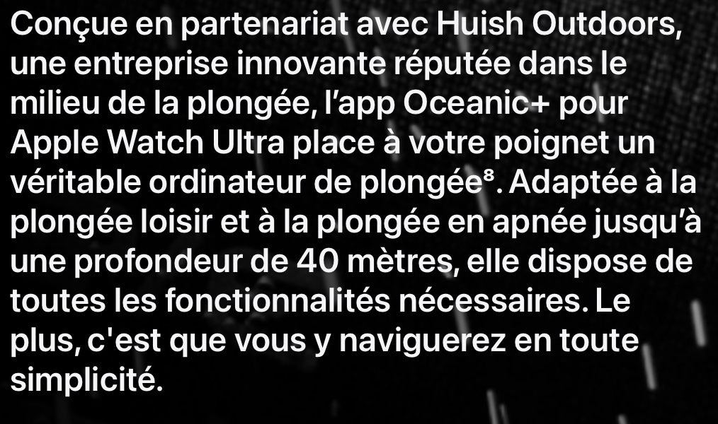 Je vois également que la page Apple Watch Ultra mentionne une application dédiée à la plongée, ça peut valoir le coup d'y jeter un œil :