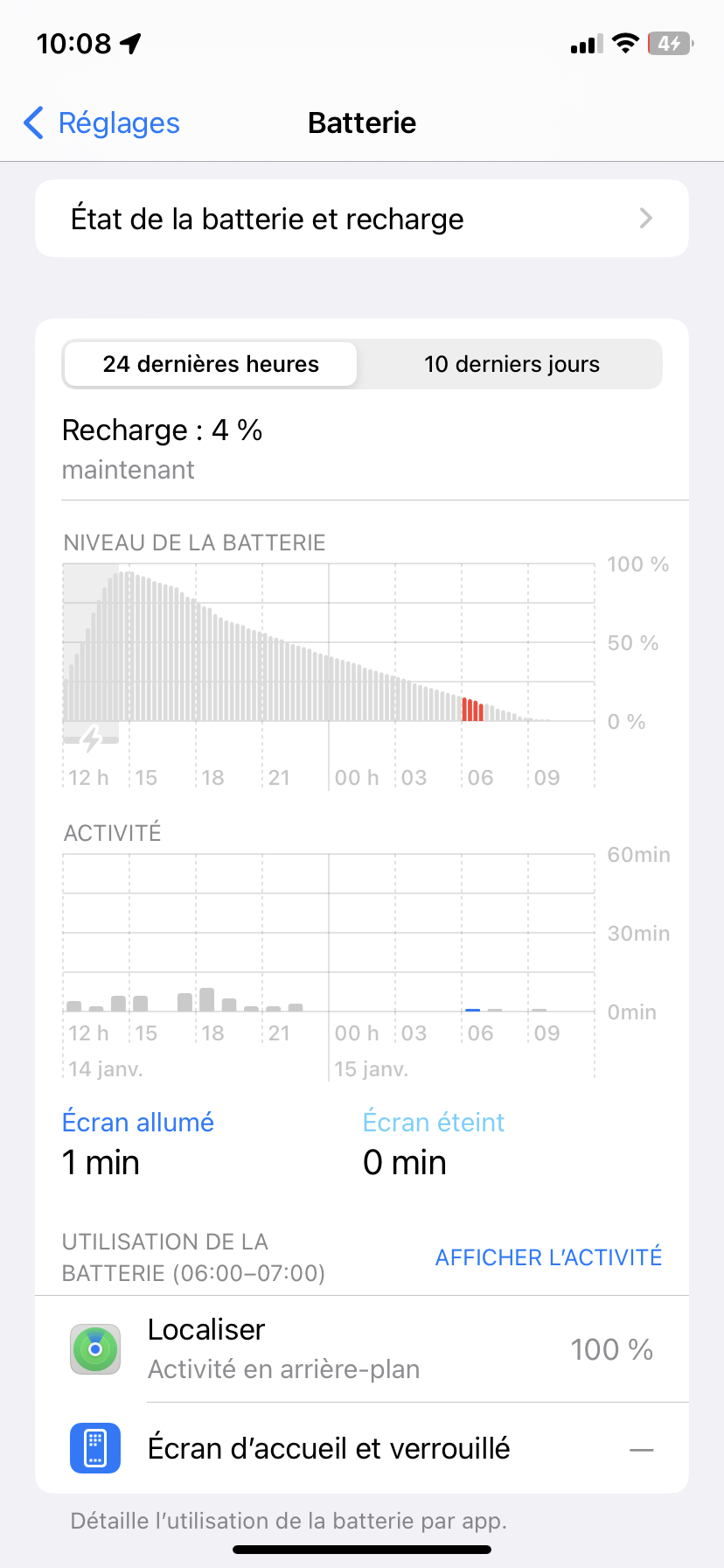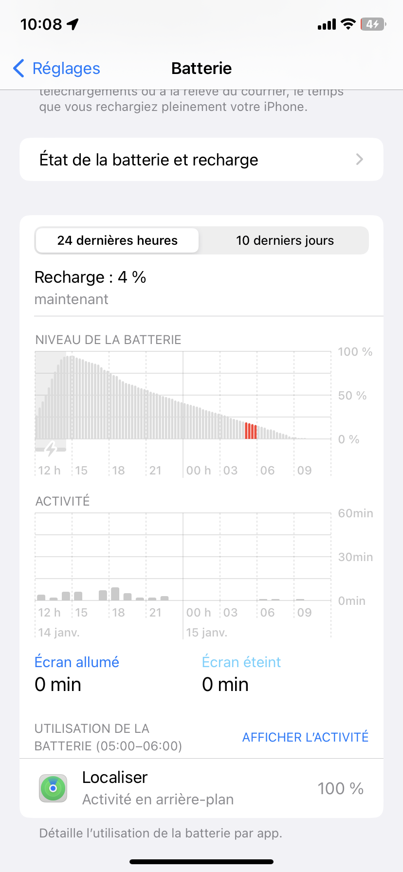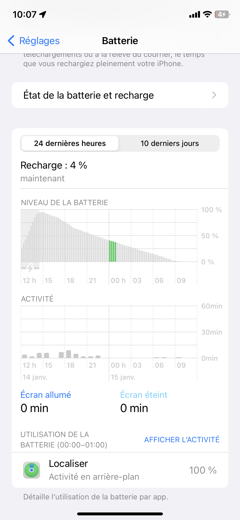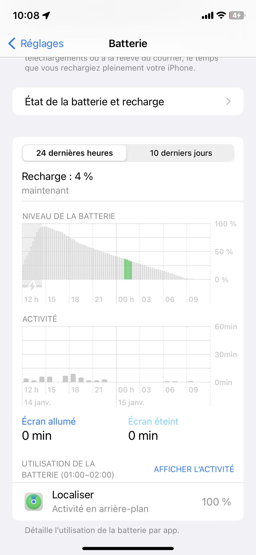 Depuis plusieurs jours j'ai remarqué que "Localiser" utilise beaucoup de batterie en arrière plan. La dernière nuit "Localiser" à même consommé + de 50% de batterie faisant éteindre mon iPhone alors qu'il était posé sur la table de nuit et toutes les applis étaient fermées.