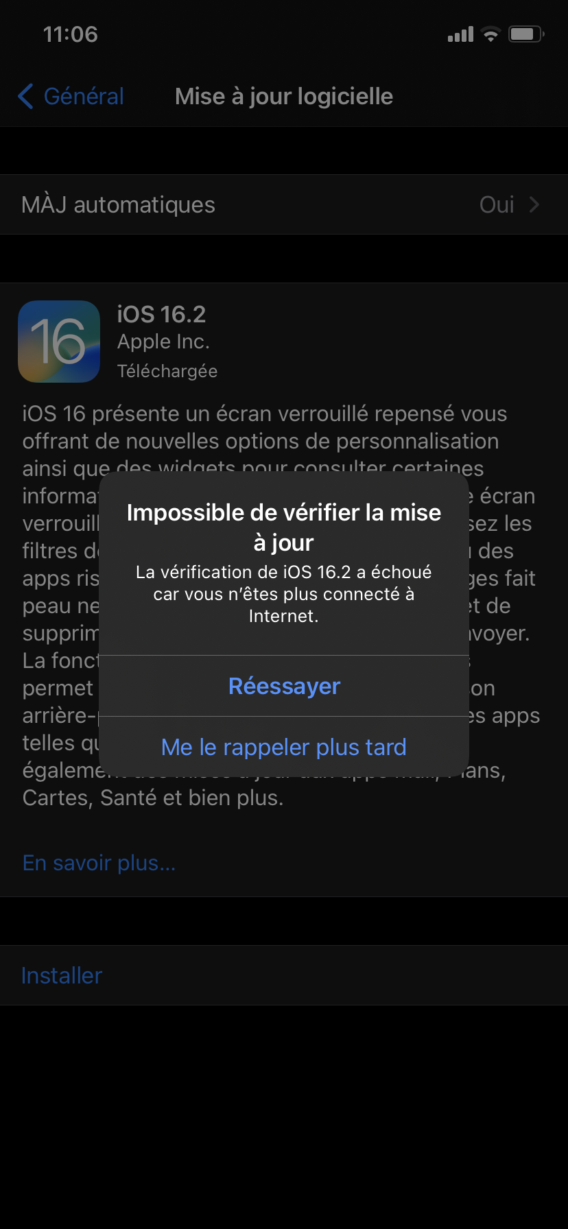 Je possède un iPhone 11 et je n’arrive pas à faire la mise à jour iOS 16.2 , à chaque fois que je tente de faire la mise à jour mon téléphone me met un message d’erreur « Impossible de vérifier la mise à jour. La vérification de iOS 16.2 a échoué car vous n'êtes plus connecté à Internet ». cependant je suis bel et bien connecté à Internet, j’ai supprimé la mise à jour pour la réinstaller mais rien n’y fait ça ne fonctionne toujours pas.