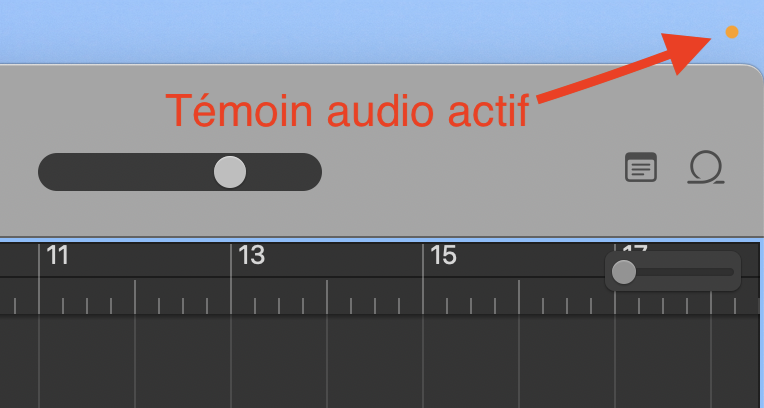 Le petit rond colorer orange en haut a droite signifie que Garage band (ou tout autre DAW) est en fonction et que la partie audio est active c'est une simple avertissement visuel comme le petit point rouge pour la caméras lorsqu'elle est active