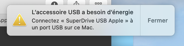 *lorsque je branche le superdrive USB (donc avec mon adaptateur multiple) un message apparait (ci-dessous). Au moment de le brancher il fait un petit bruit comme si il se mettait en marche, puis finalement non.