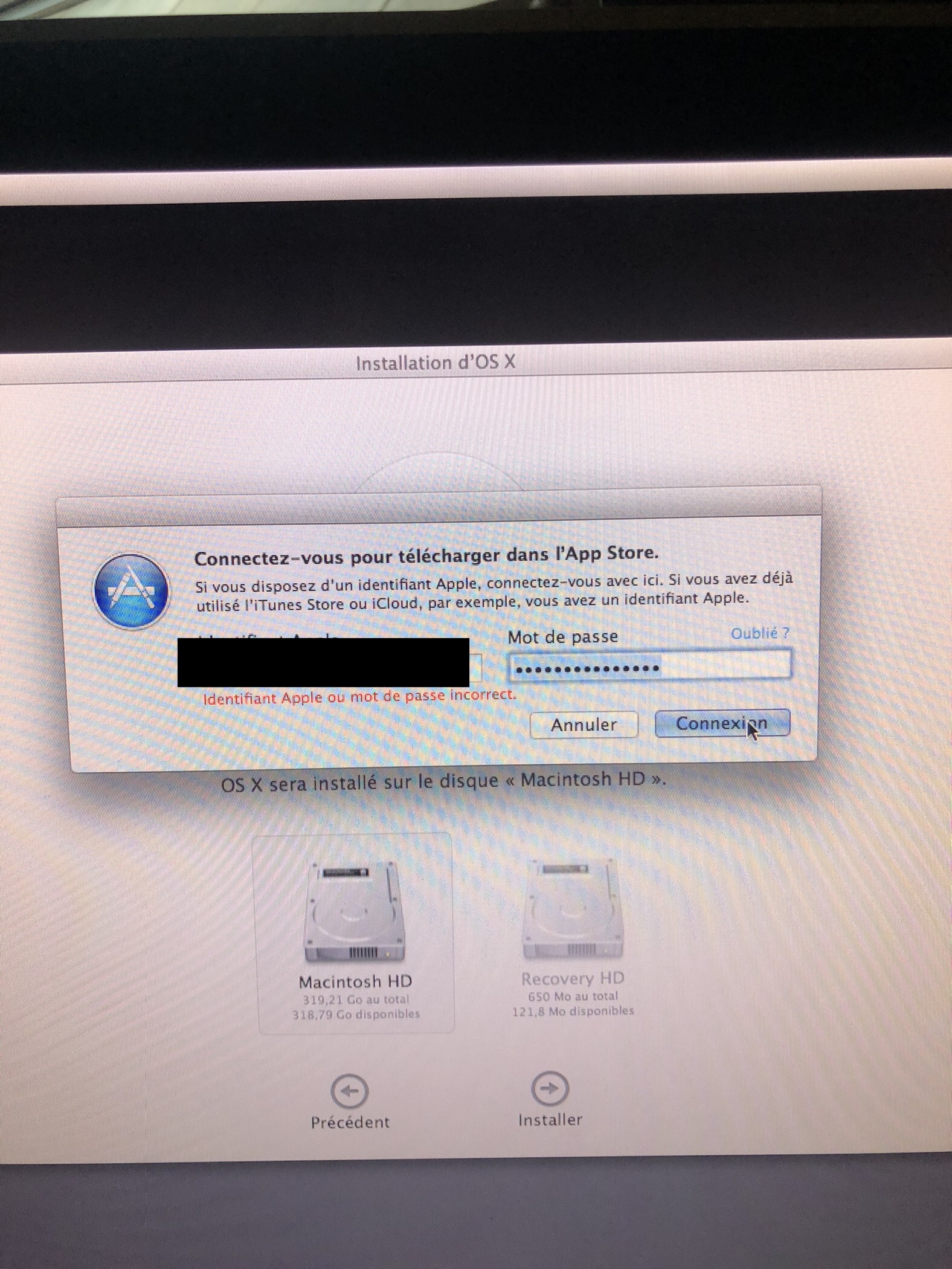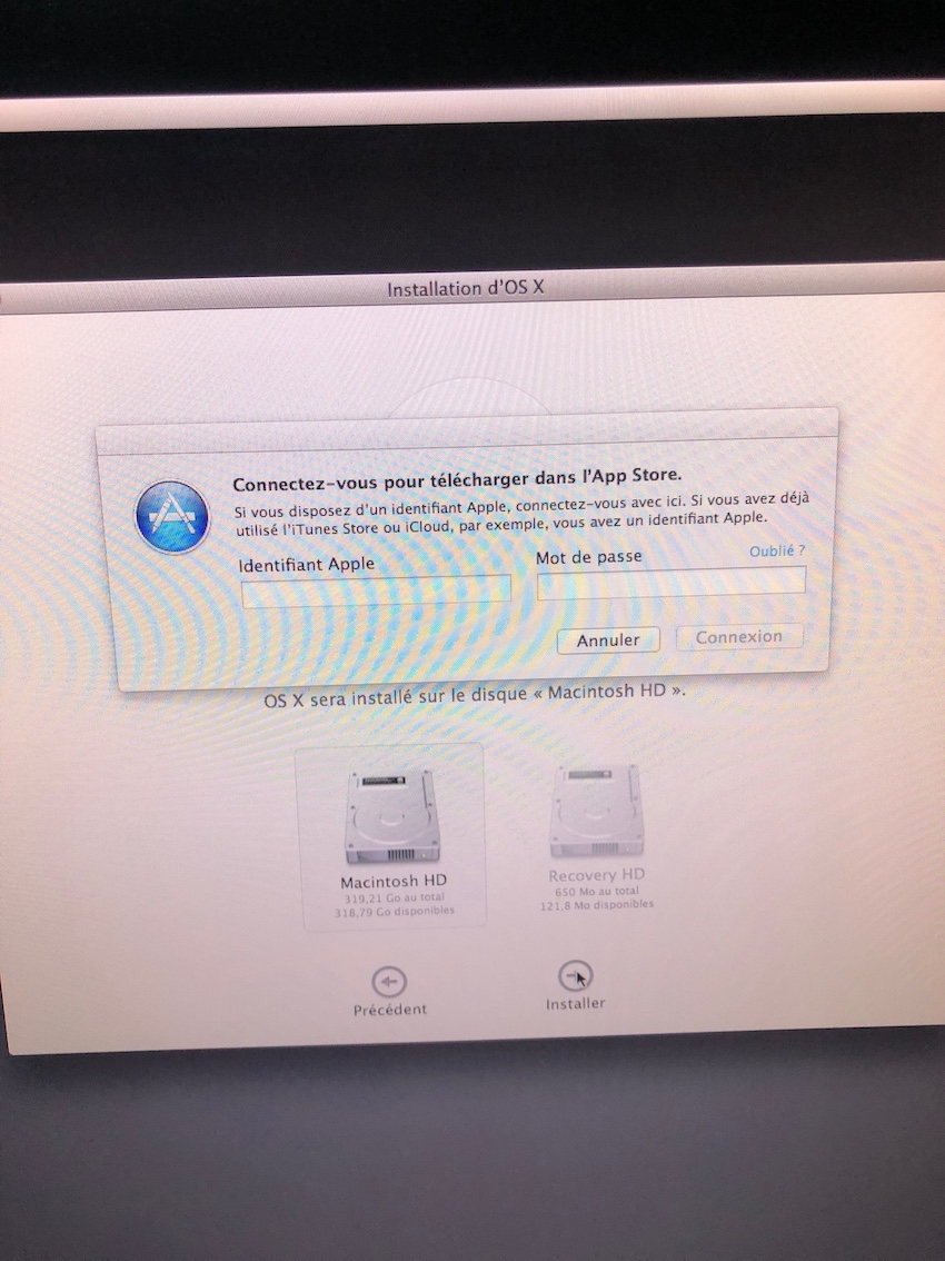 J'ai donc effacé le disque "Macintosh HD" Tout c'est bien passé mais quand je fait réinstaller OS X (Mavricks) et qu'il me demande mon ID impossible de me connecter, alors que j'ai d'autre ordinateur connecté avec cette ID. Il m'indique "identifiant apple ou mot de passe incorrect"
