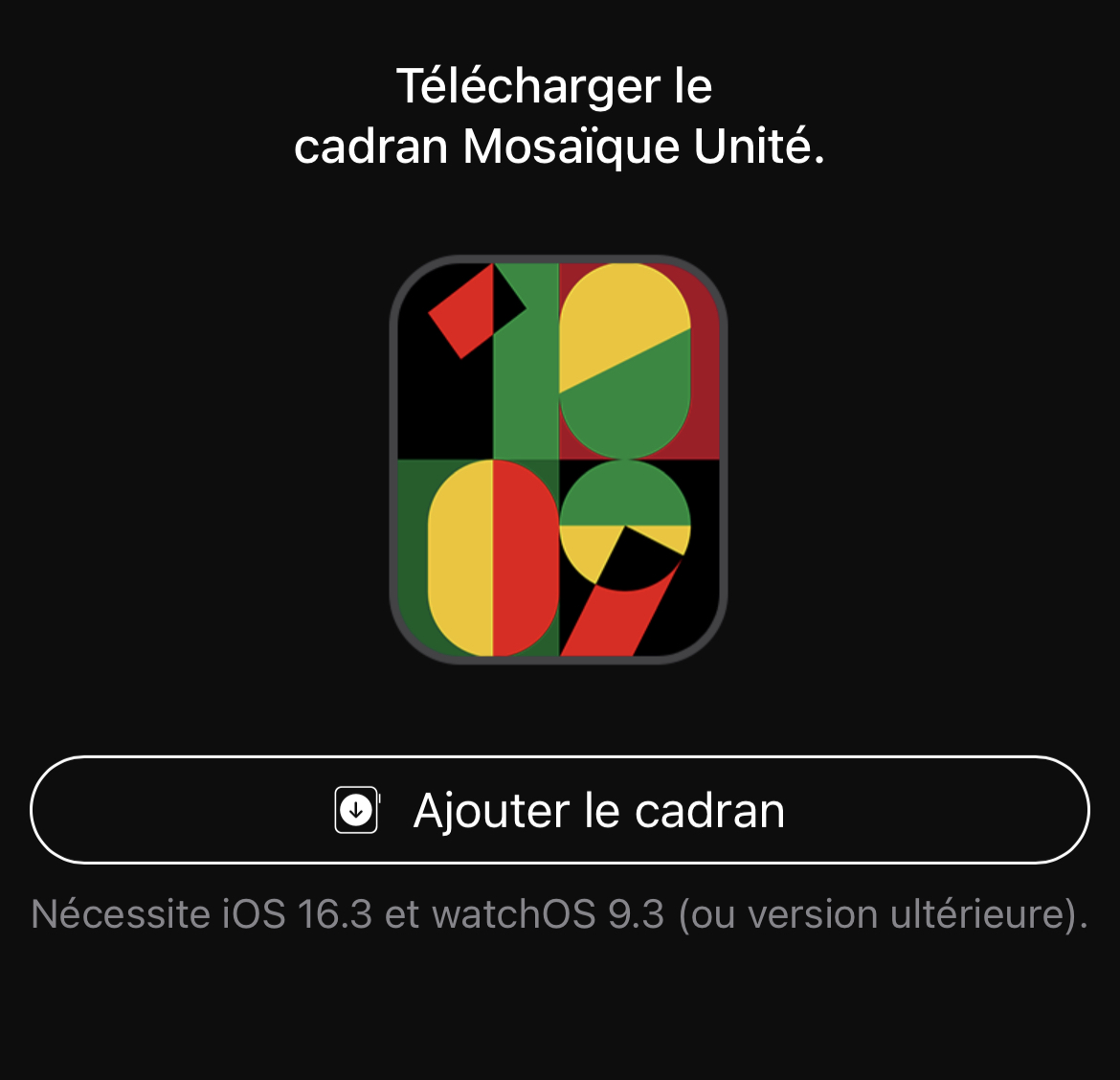 Donc la mise à jour permet le téléchargement du cadran, mais ne l'inclue pas par défaut. Du coup, ouvre le lien plus haut depuis ton iPhone, et ça te donnera la possibilité de télécharger le cadran. Ça se présente comme ça sur mon iPhone :