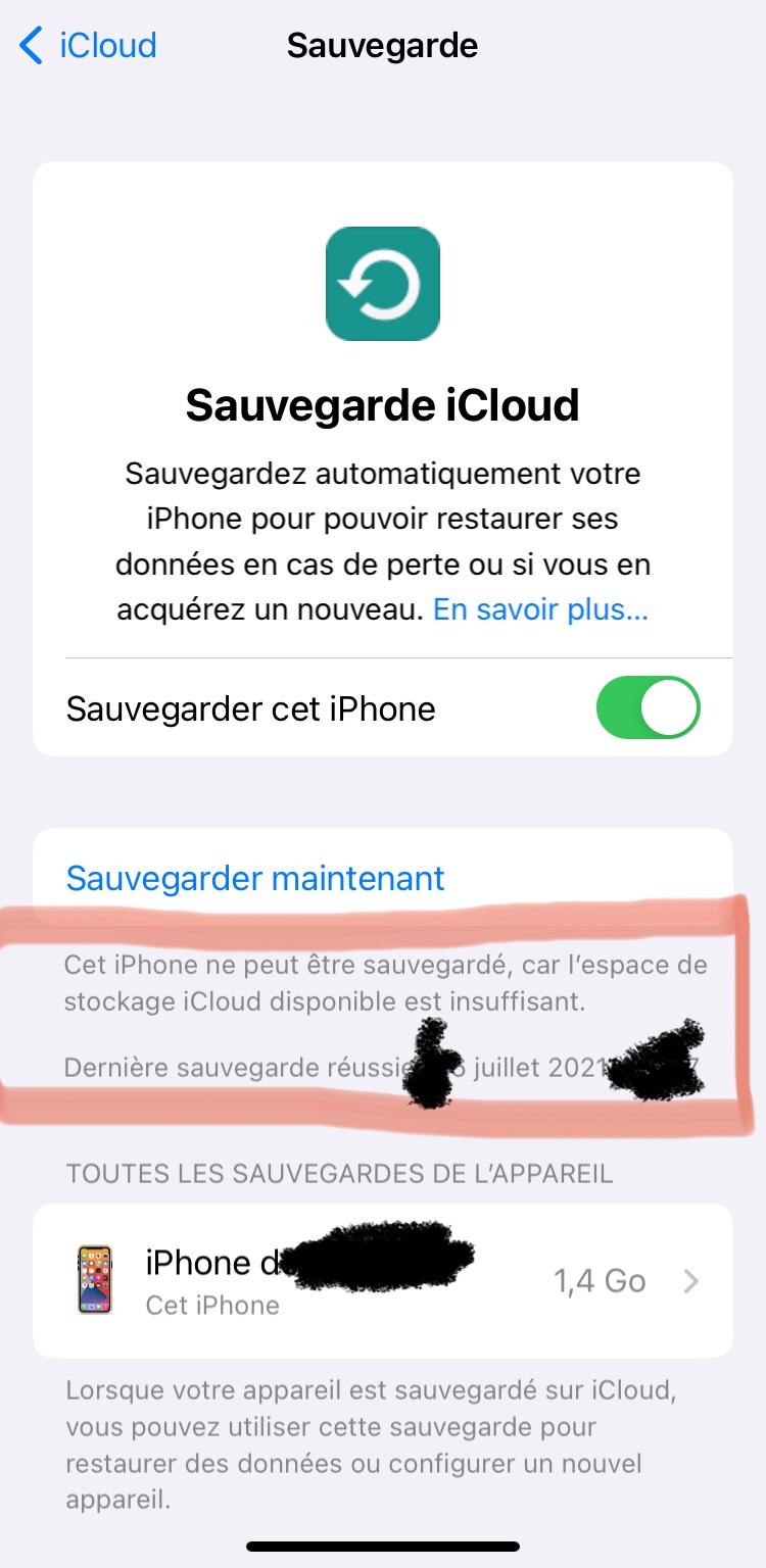 je cherche à sauvegarder les données de mon iPhone mais mon espace de stockage se dit « insuffisant » alors qu’il y a encore assez d’espace. c’est un iPhone 11.