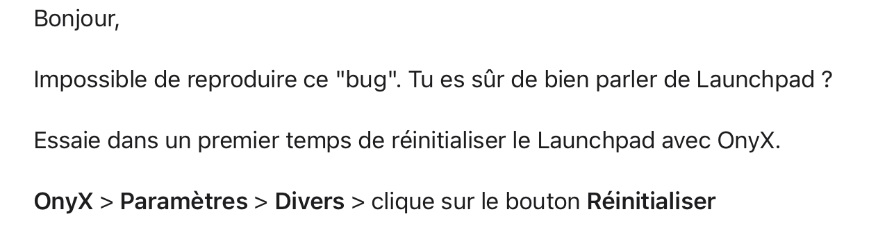 Quand on ouvre le launchPad, qu'on recherche une application exemple "Notes", si vous déplacer sans faire exprès l'icône de l'application sur la droite ou gauche en voulant simplement l'ouvrir, elle reste figée sur l'écran !