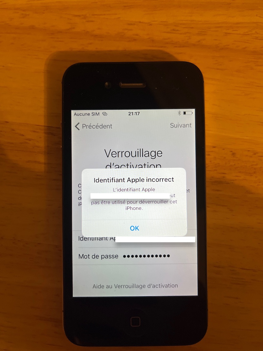 Afin de désactiver le verrouillage d'activation de votre iPhone il va falloir rentrer votre identifiant (adresse mail) et mot de passe de votre compte Apple utilisé lors de la configuration de l'iPhone. Vérifier bien ceci car l'iPhone ne se désactivera pas si vous n'utilisez pas le bon compte Apple !