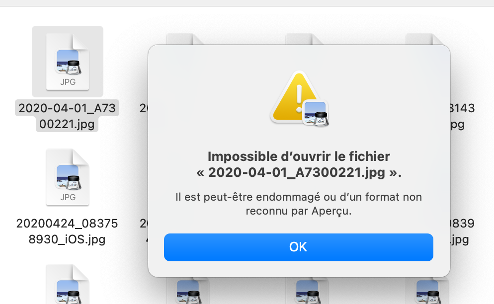 Je ne rencontre pas le problème avec les fichiers jpeg, xlsx, docx, pdf, ça le faisait au début avec les fichiers vidéos mais ça semble réglé, mais c'est principalement sur les fichiers mp3 que j'ai le problème.