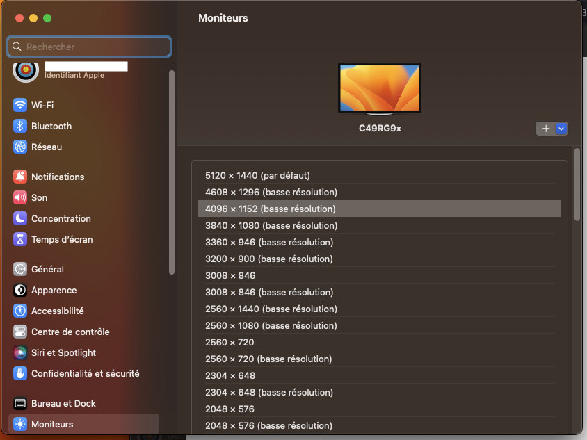 je rencontre un problème de résolution avec mon mac mini sur mon ecran 49" CRG90 LC49RG90SSRXEN, quand je vais dans le réglage "Moniteurs'" j'ai plusieurs choix qui s'offrent à moi.
