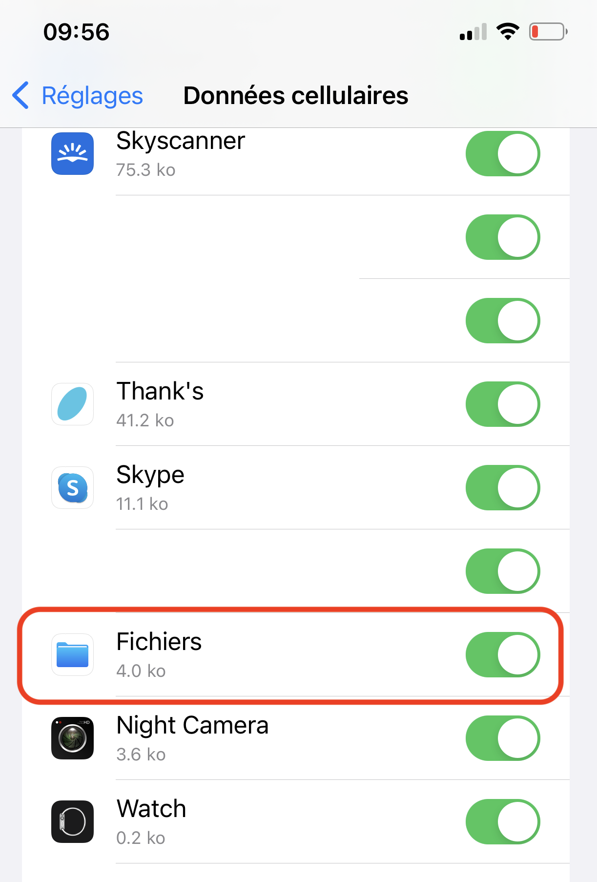 Autre chose que tu peux vérifier, c'est si tu as autorisé l'utilisation de ton app Fichiers avec les données cellulaires. Si cette option n'est pas activée, cela veut dire que tu es obligée de passer par du Wi-Fi pour consulter des documents qui sont dans iCloud Drive.