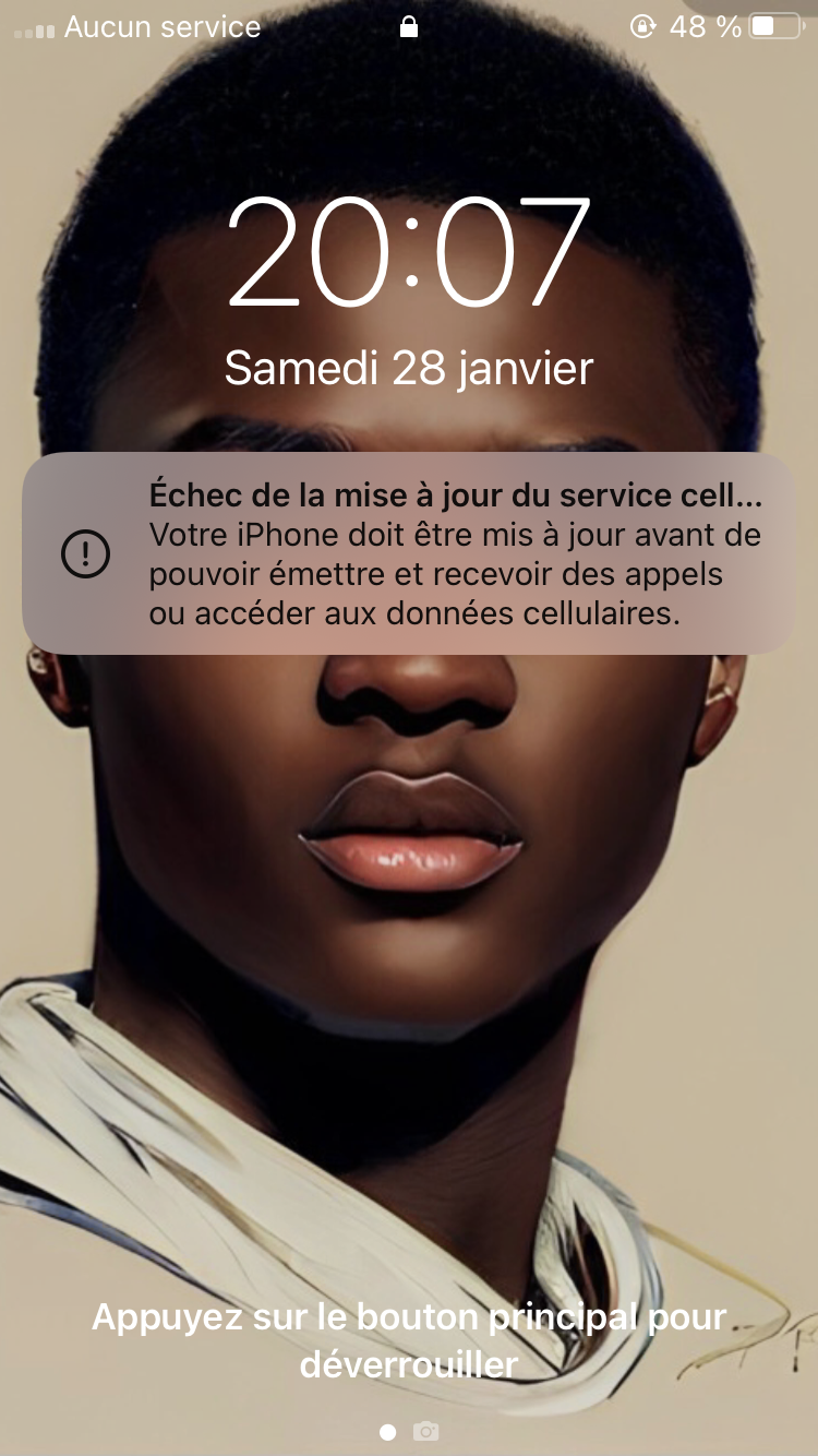 Bonjour Abdelndiaye, sur votre iPhone on constate que votre iPhone n'est pas connecté en Wi-Fi et que effectivement "Aucun service" s'affiche aussi puis qu'il faut une mise à jour pour les données cellulaires.