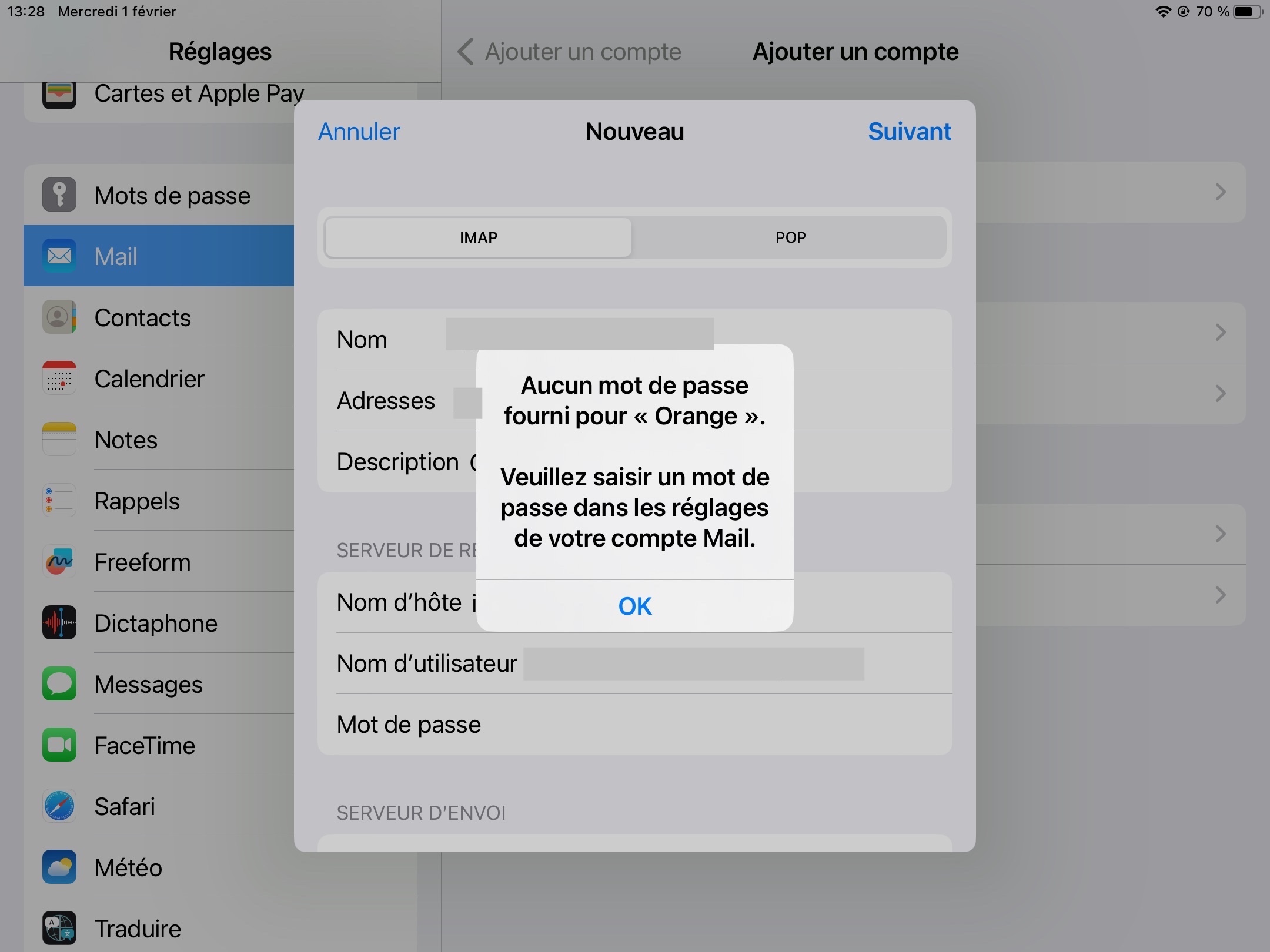 Si le compte a déjà été ajouté, tu peux essayer de le supprimer (Réglages > Mail > Comptes > Orange > Supprimer le compte) puis le configurer de nouveau.