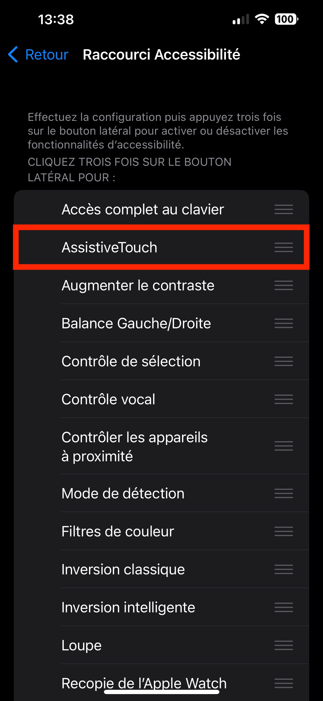 Il faudrait aussi que tu ailles dans Réglages > Accessibilité > Raccourcis Accessibilité, que tu t'assures que l'option AssistiveTouch n'est pas sélectionnée et que tu la désélectionnes si elle l'est. En effet, si tu as activé un raccourcis accessibilité pour la fonctionnalité AssistiveTouch, celle-ci va s'activer sur ton iPhone si tu cliques 3 fois sur le bouton latéral ou sur le bouton d'accueil de ton iPhone même par erreur.