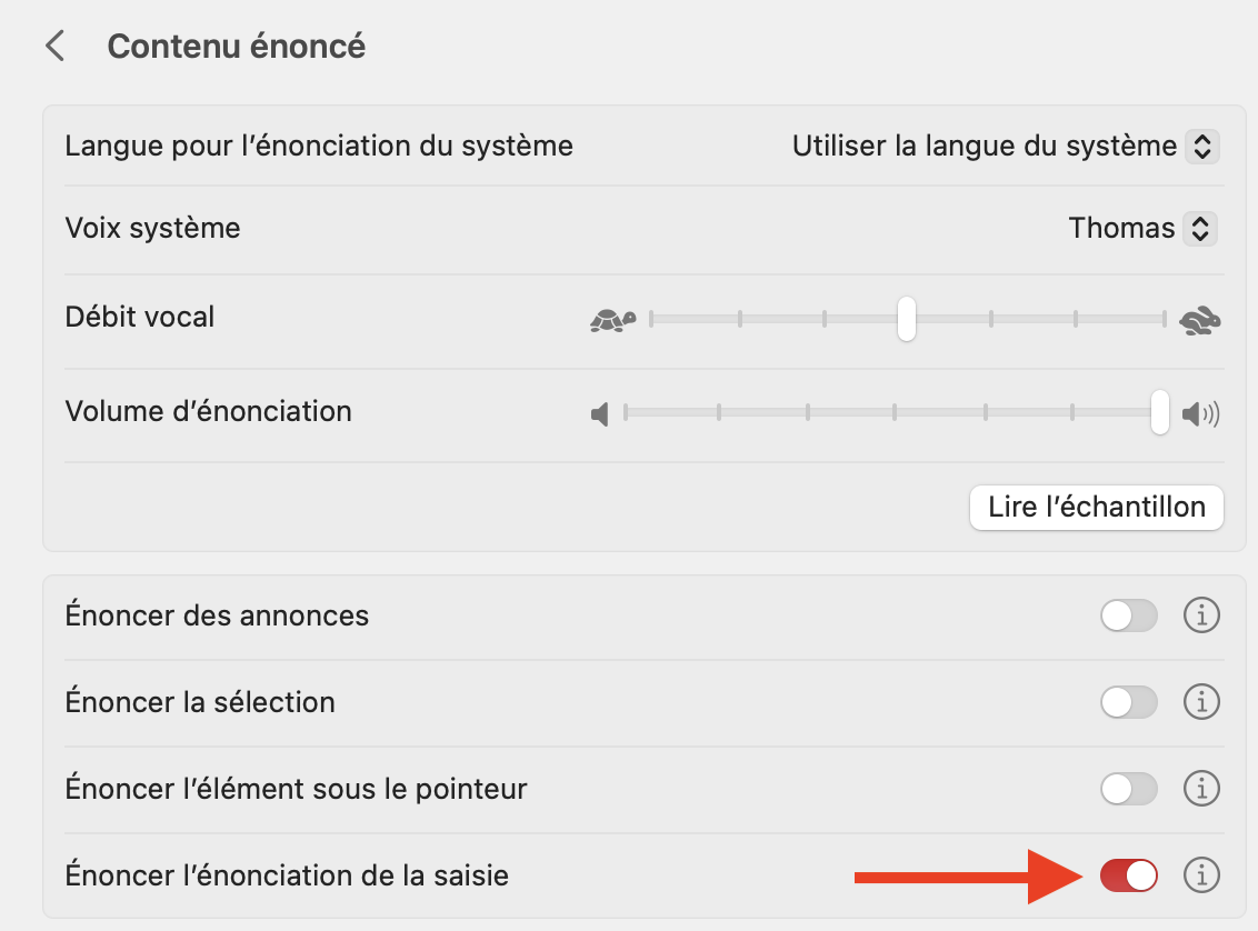 "Réglages Système" "Accessibilité" " Enoncer l'énonciation de la saisie".
