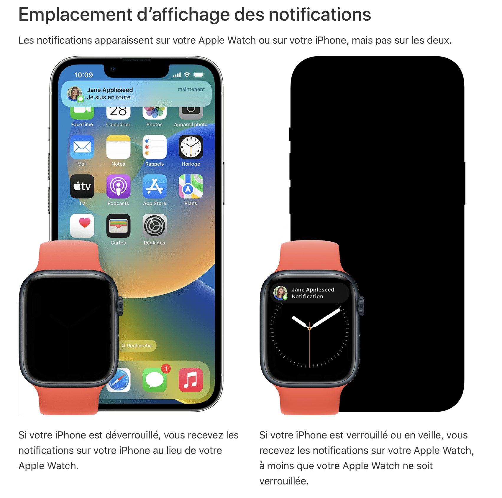 Les notifications sont donc envoyées sur ton Apple Watch uniquement lorsque ton iPhone est verrouillé ou en veille. Par contre, les notifications sont envoyées sur ton iPhone (et non pas sur ton Apple Watch) lorsque celui-ci est déverrouillé. En effet, ton iPhone étant déverrouillé, il est probable que ton attention soit portée dessus. Tu verras donc directement les notifications qui s'affichent dessus.