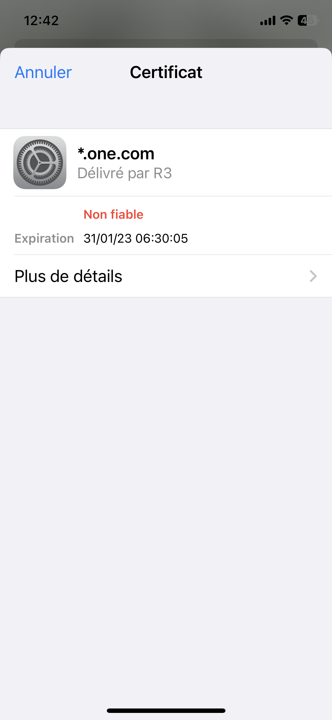 Es-tu le premier utilisateur de cet iPhone ? As-tu tenté de supprimer le certificat depuis que celui-ci s'affiche ?