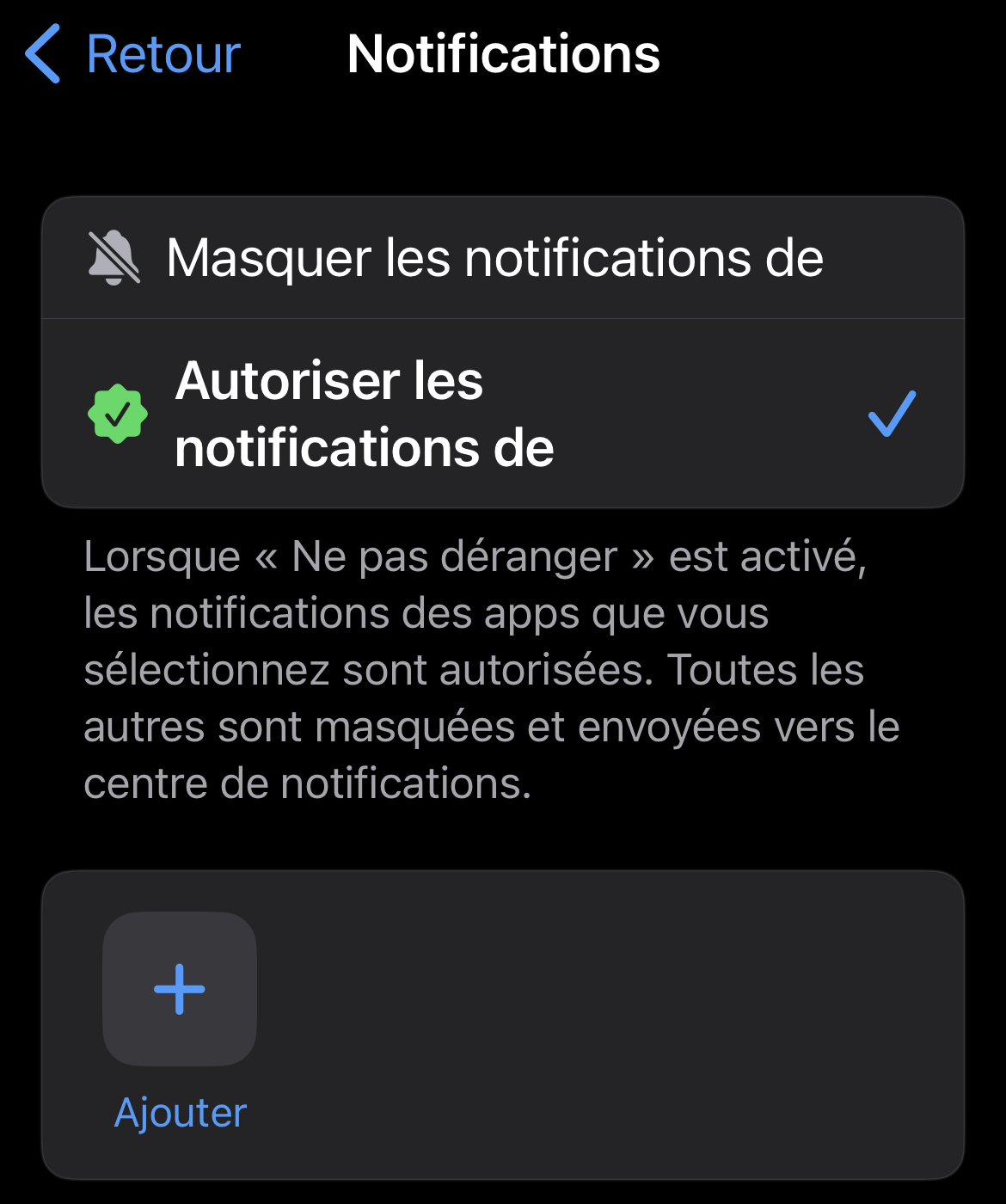 Pour les options dans Réglages > Concentration > Ne pas déranger > Apps :