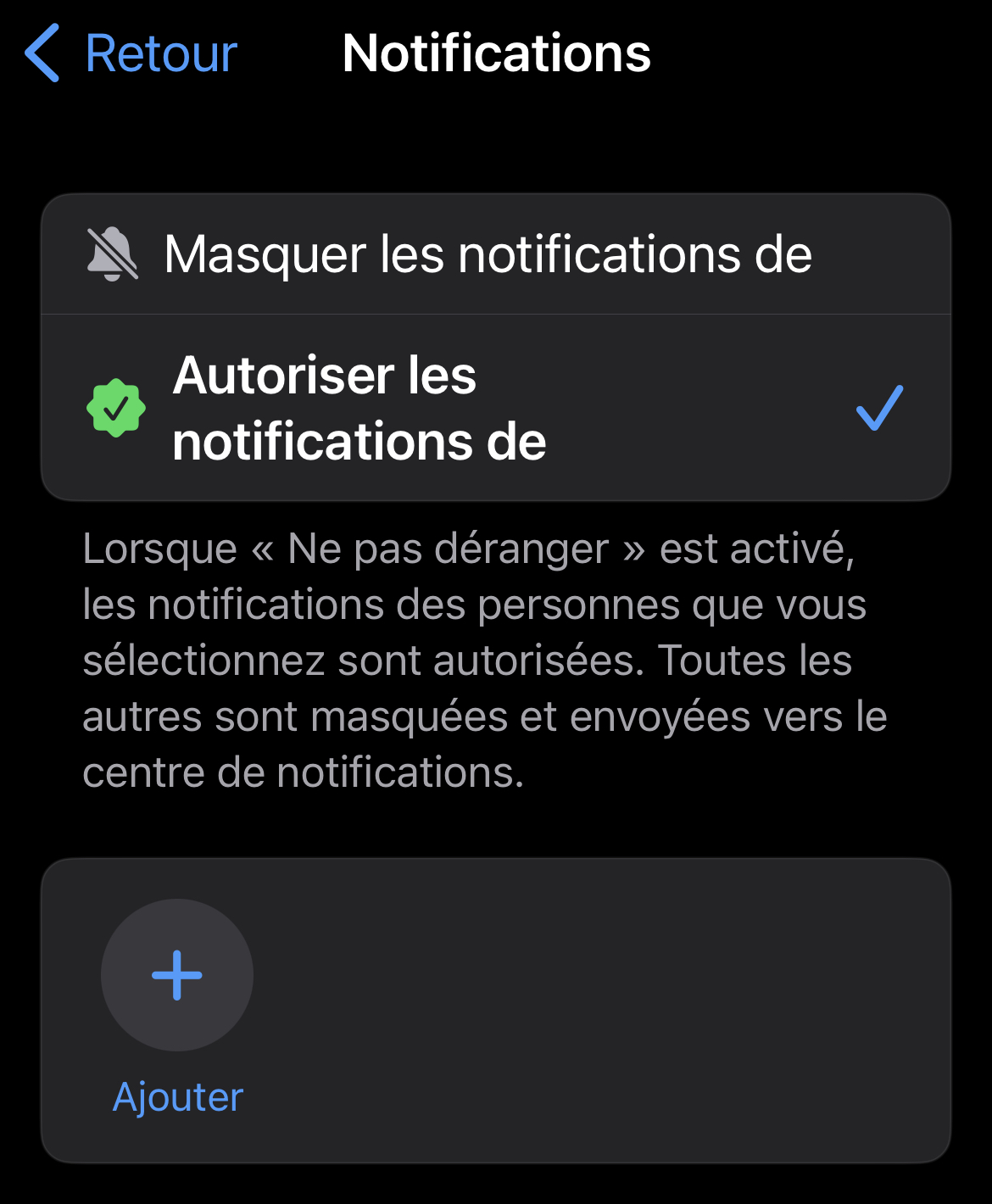 Il est possible que certains des réglages en place soient incorrects, du coup. Quand tu vas dans Réglages > Concentration > Ne pas déranger > Personnes, comment sont configurées tes options ? Même question pour les Apps 😉.