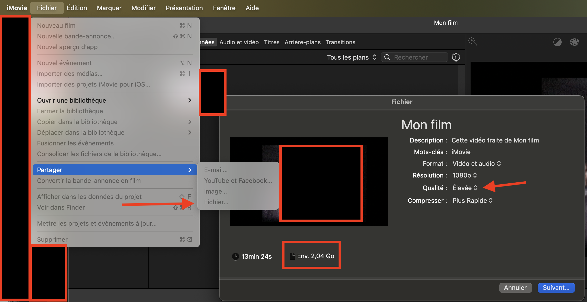 Merci pour votre réponse et excusez-moi pour le retard, mais je ne pouvais pas vous répondre avant. C'est la 1ère fois que je fais un montage avec Imovie, avant j'ai travaillé avec FinalCut Express, qui n'est plus compatible avec Big Sur. Je pouvais compresser un film d'environ 150 Go à environ 35 Go. Qui permettait une projection de bonne qualité. Hors avec Imovie si je passe comme indiqué par "Partager- Fichier" mon film de 189 Go est compressé à 7.69 Go. d'où une perte de qualité trop grande . C'est pourquoi je cherche une solution avec une compression moins importante. Voilà mon problème. Cordialement et bonne journée. LaCaroline3