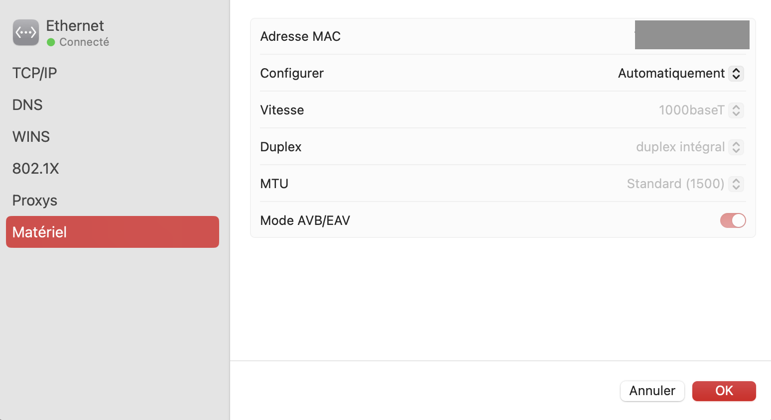 J'ai aussi tenté de changer le MTU et activer le Mode AVB/EAV mais rien ne change, tout reviens systématiquement comme au départ même si je sélectionne "Configurer Manuellement".
