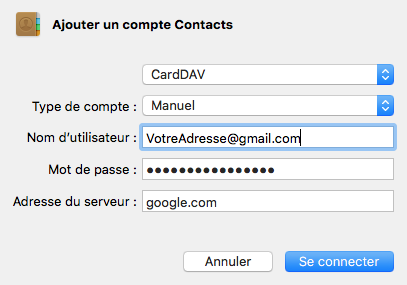 Et pour le mot de passe, celui de 16 caractères que vous aurez généré spécifiquement pour l'application Contacts ICI (en vous connectant à nouveau).