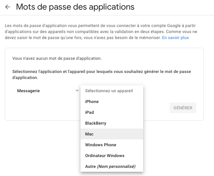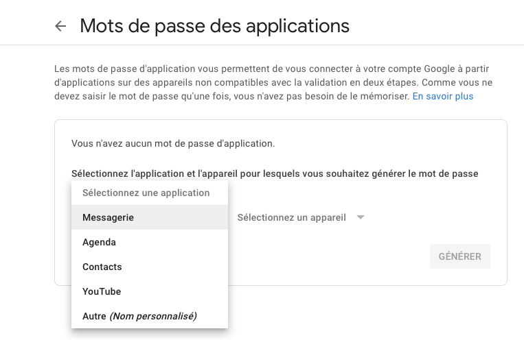 pour pouvoir générer le "Mots de passe des applications" proposé par Google via le lien que vous avez donné plus haut, il faut impérativement avoir effectué la "validation en deux étapes" demandée par Google.