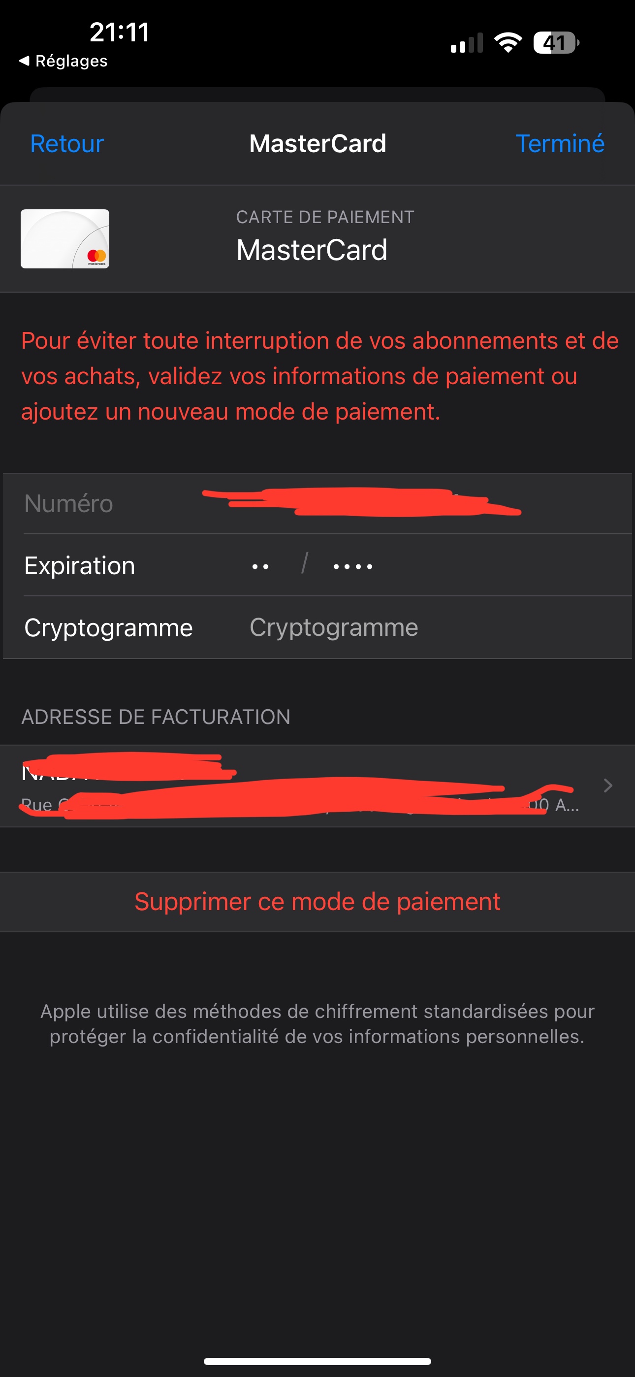 je rencontre un problème de refus de mode de paiement suite à une mise à jour iOS 16.3.1