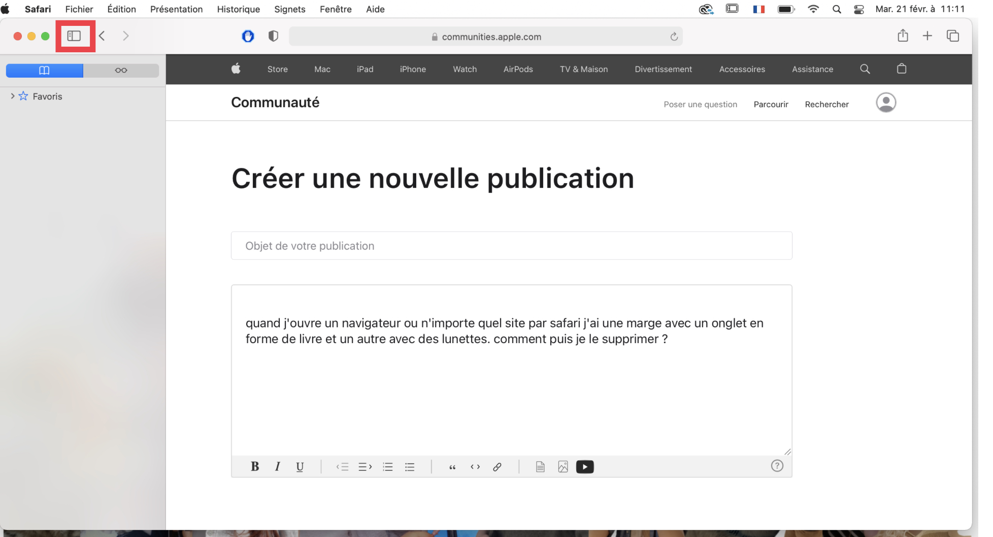 quand j'ouvre un navigateur ou n'importe quel site par safari j'ai une marge avec un onglet en forme de livre et un autre avec des lunettes. comment puis je le supprimer ?