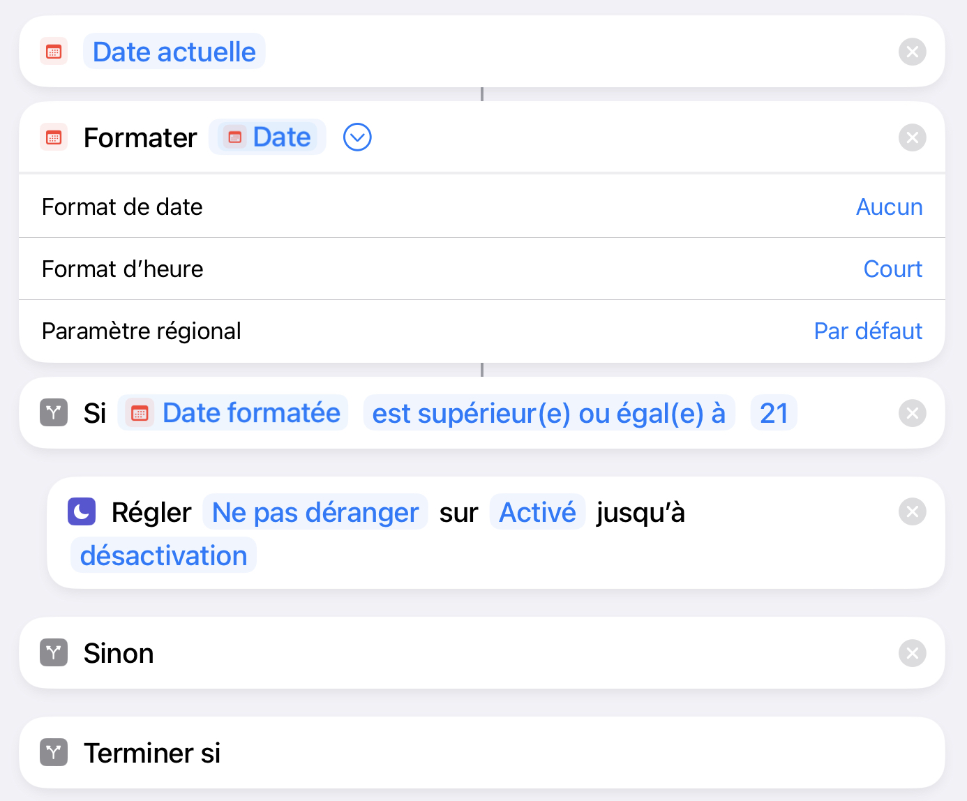 Bonjour, j’ai mis une automatisation du mode repos dès que mon téléphone est branché sur batterie. Seulement j’aimerais que cette automatisation ne soit activée que en soirée ( pas lorsque je me connecte à mon ordinateur ou ma voiture en journée). Est-ce possible de régler cette condition dans les automatisations ? Mon but est que le mode repos s’active quand je suis effectivement au lit, et pas à des heures fixes comme le programme sommeil le propose. Merci d’avance à tous