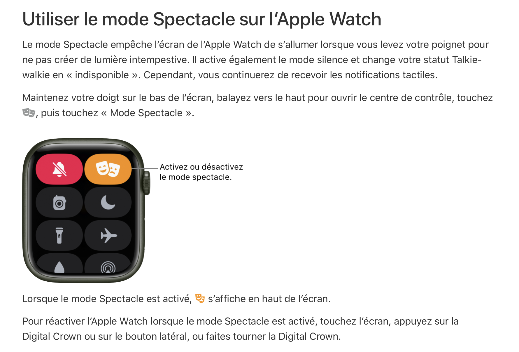 Je viens de faire un test de mon côté et je pense avoir trouvé la raison. Est-ce que tu as le mode Spectacle d'activé sur ton Apple Watch ?