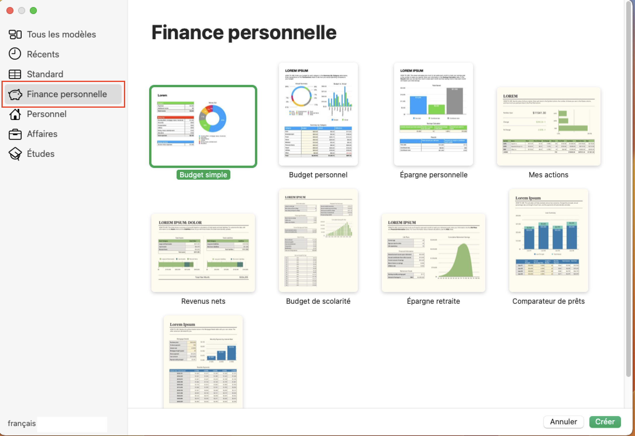 TricotRaye_ fait référence aux modèles que vous pouvez utiliser lorsque vous créer un nouveau fichier Numbers. Lorsque vous créez un nouveau fichier, cet écran s'affiche ; choisissez le modèle qui vous convient le mieux :