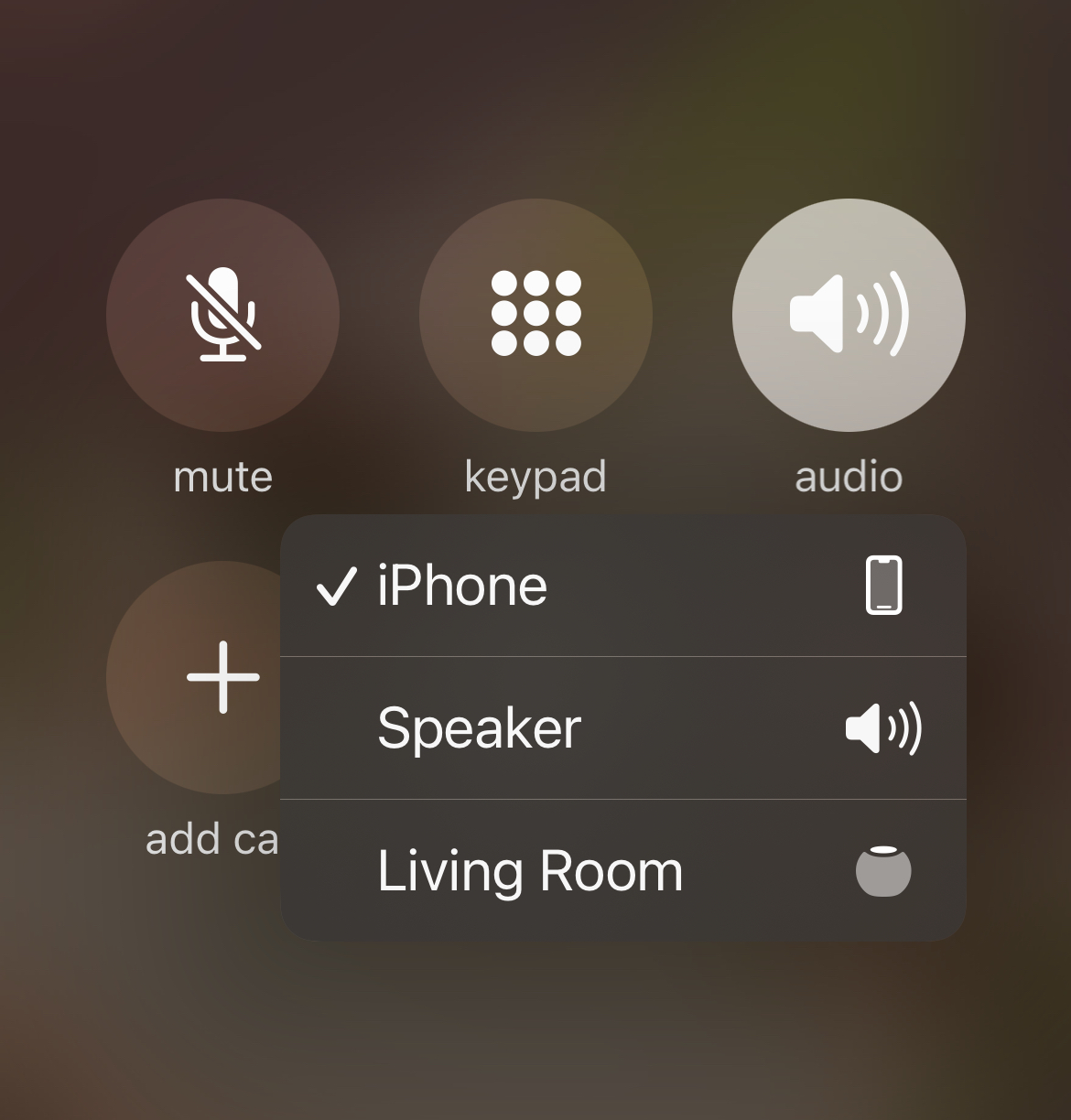 Si c'est bien le cas, lors du prochain appel, tu pourras cliquer sur l'icône Audio, puis sélectionner l'iPhone comme sortie. Comme ceci :