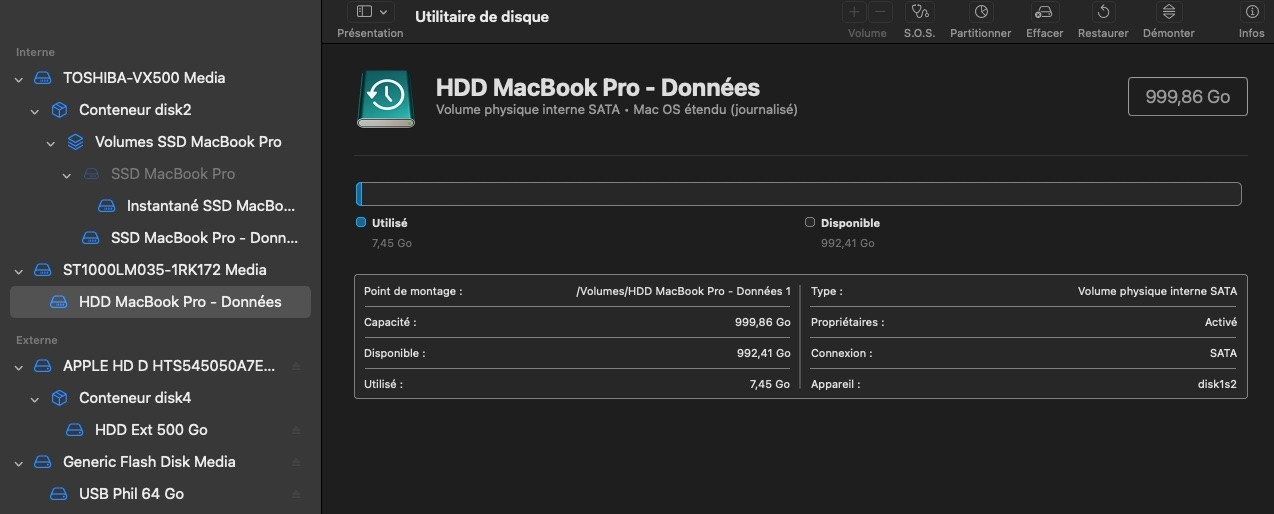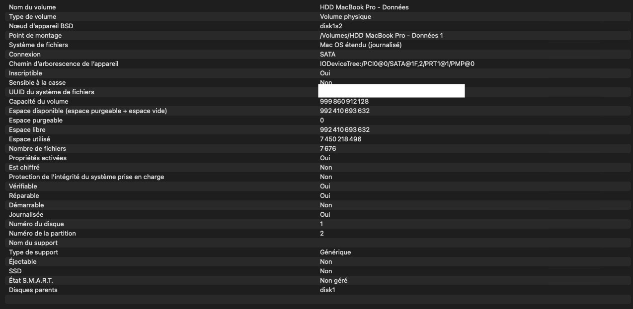 Disque interne SATA Disk 1 :HDD 1To Mac OS étendu (journalisé) Table de partition Guid