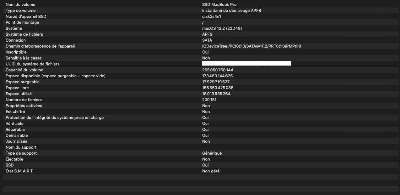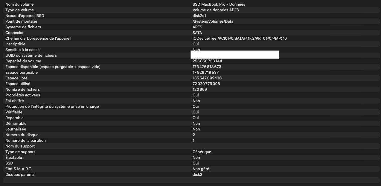 J'ai Disque interne SATA Disk 0 :SSD 256Go APFS Table de partition Guid