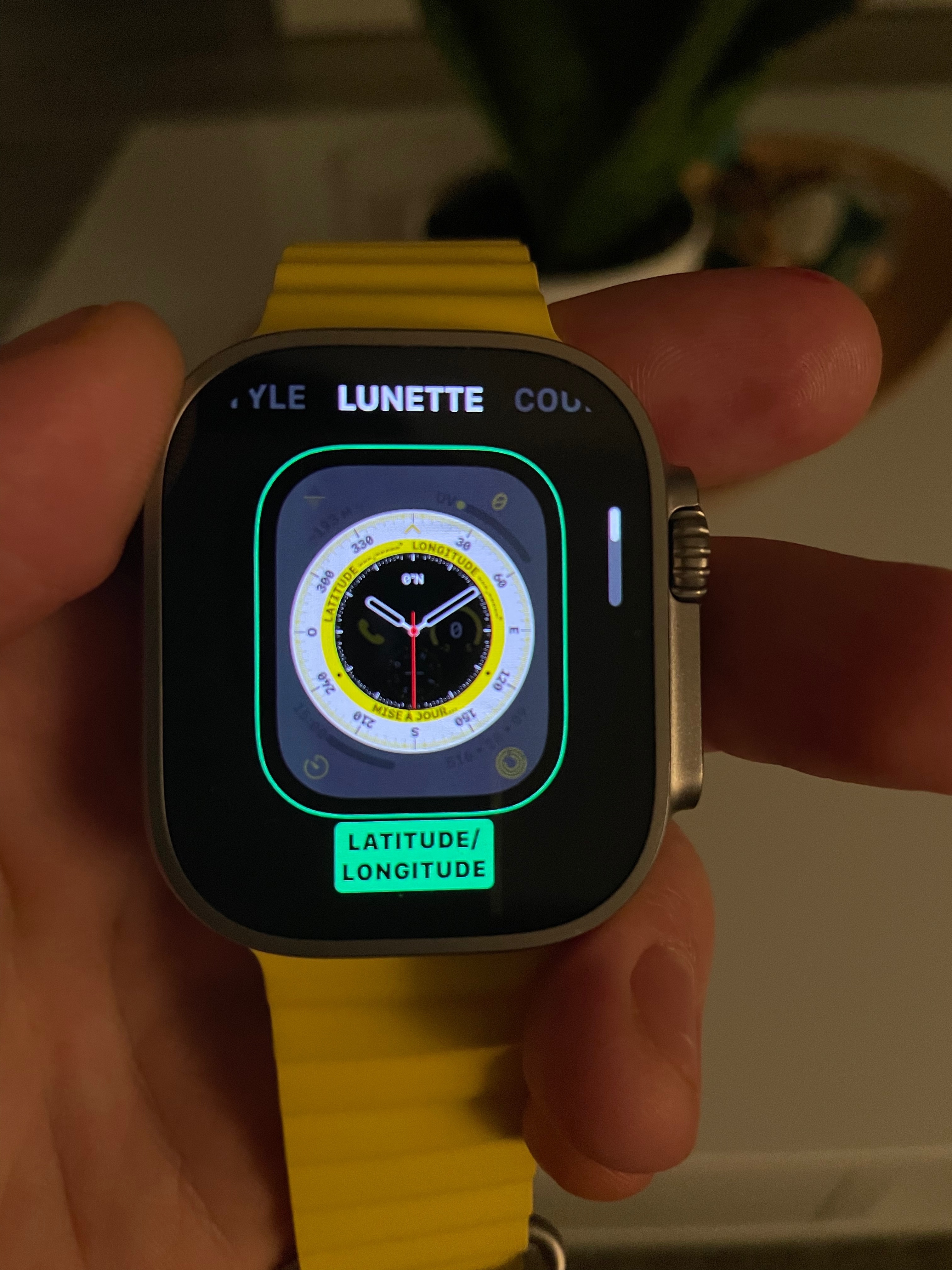 Je viens de faire le test et pour modifier la lunette sur le cadran de ton Apple Watch Ultra, il faut que tu touches le cadran de ton Apple Watch, que tu cliques sur Modifier > Lunette, puis que tu fasses tourner la Digital Crown pour choisir entre les trois propositions : Latitude/Longitude, Altitude/Inclinaison et Aucun.