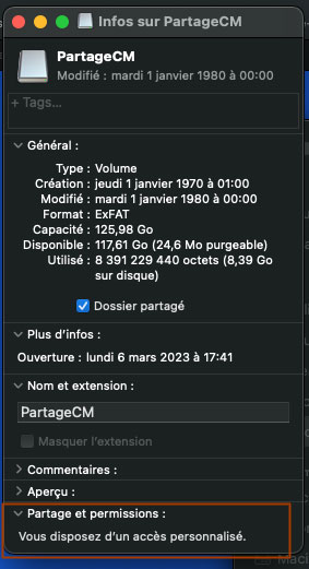 je partageais jusqu'à présent une clé USB avec une autre personne, mais cela ne fonctionne plus. Nous n'avons plus accès à la rubrique "Partage et permissions" et aux réglages qu'elle propose d'habitude (et qui figurent dans l'aide Apple), elle affiche uniquement "Vous disposez d'un accès personnalisé".