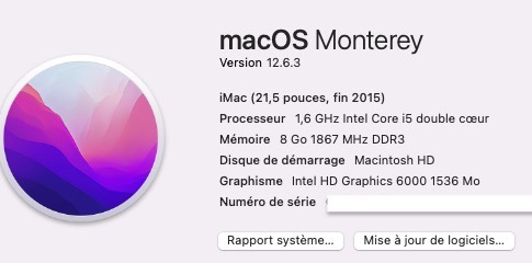 Un vieil iMac, fin 2015 entrée de gamme, l'un des derniers sous la barre des 1000 euros :( tourne sous Monterey.