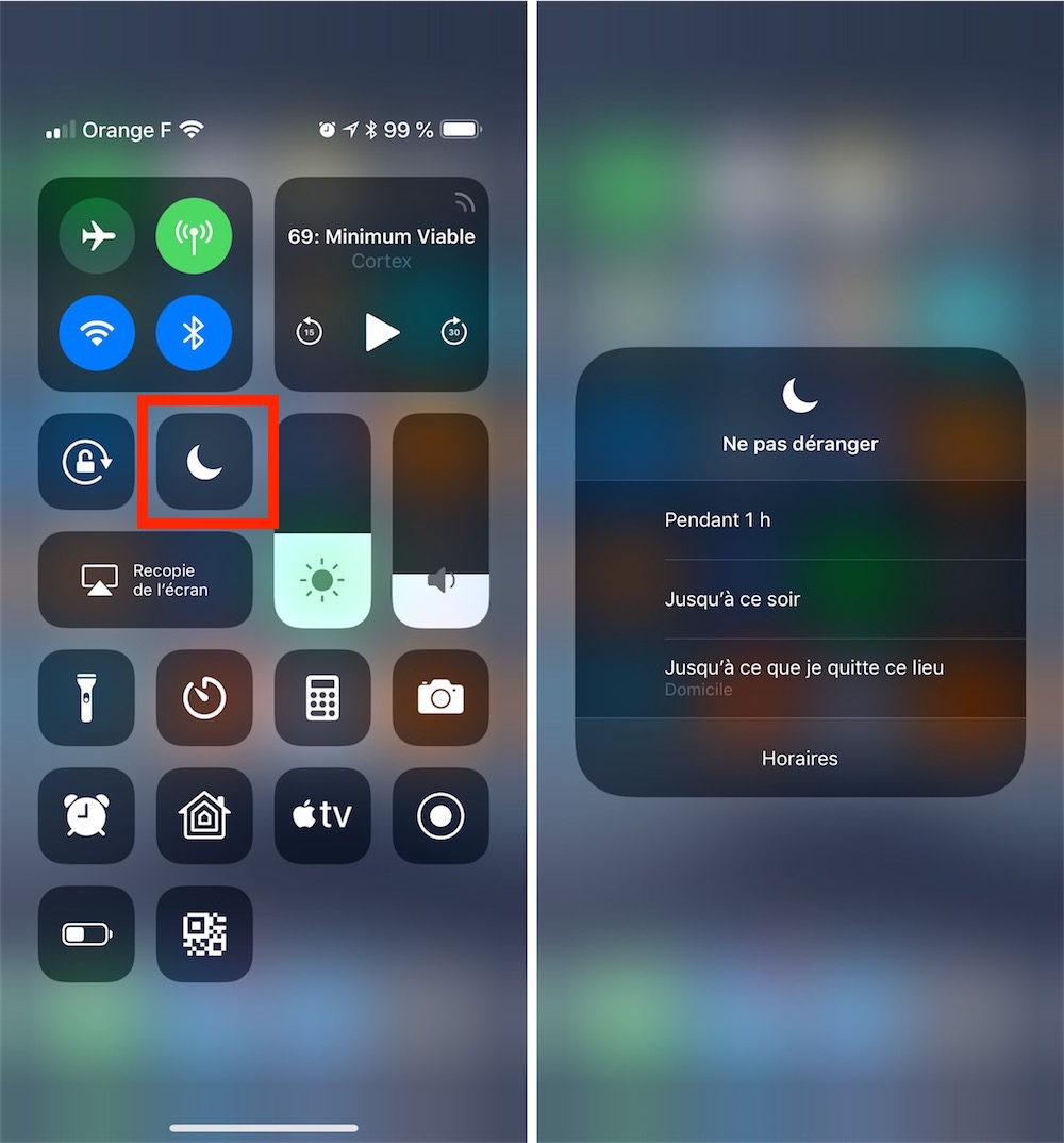 Il est possible depuis le centre de contrôle de désactiver le mode "Ne pas déranger" en cliquant dessus tout simplement (Icône de la petite lune)