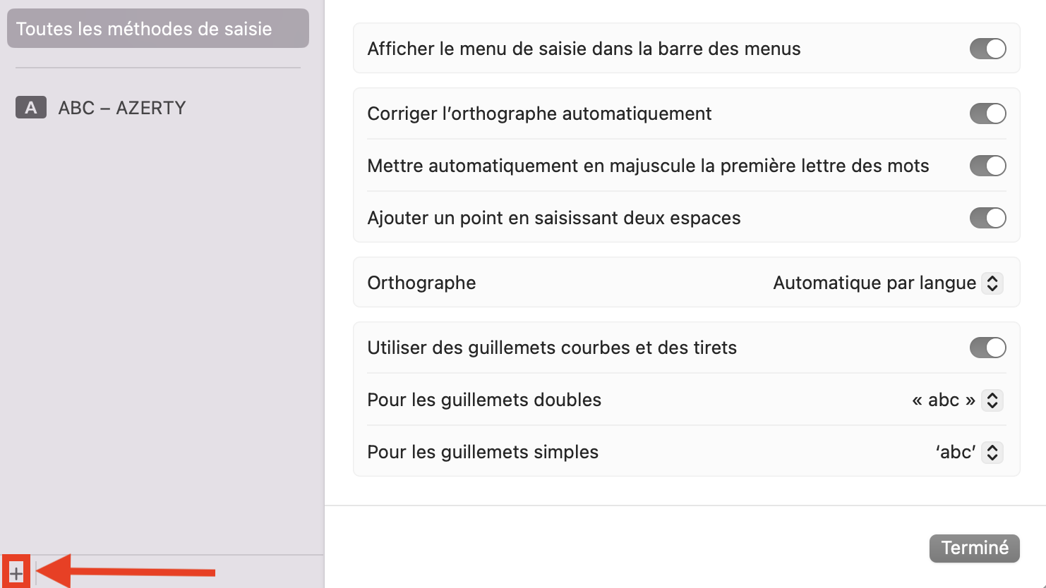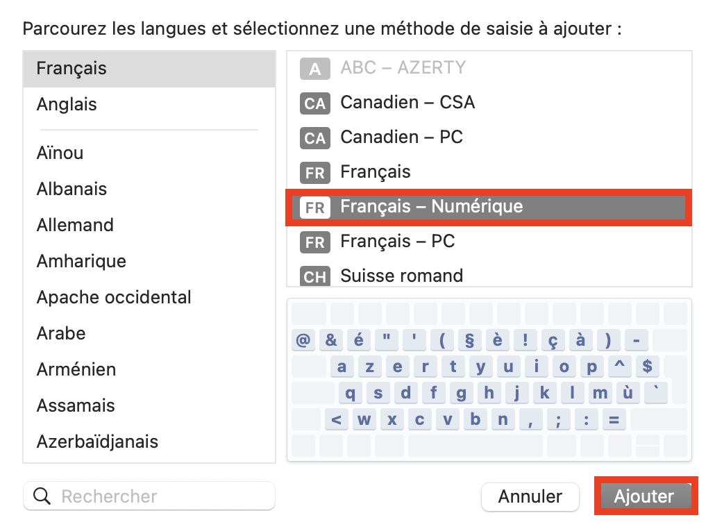 Pour pouvoir taper plusieurs chiffres à la suite sans avoir à maintenir la touch Maj ⇧ de ton clavier enfoncée, il faut que tu utilises la méthode de saisie Français - Numérique. Pour ajouter la méthode de saisie Français - Numérique à ton clavier, il te suffit d'aller dans > Réglages du système > Clavier et de cliquer sur Modifier en face de Méthodes de saisie. Ensuite, il faut que tu cliques sur le + en bas de la colonne Toutes les méthodes de saisie, puis que tu sélectionnes Français - Numérique et que tu cliques sur le bouton Ajouter.