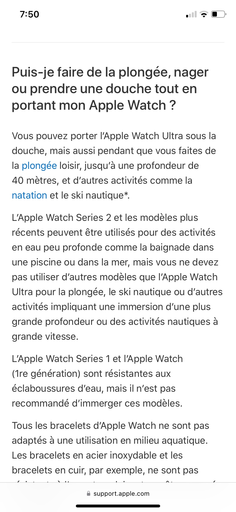 Réclamation concernant Apple Watch après séance de natation