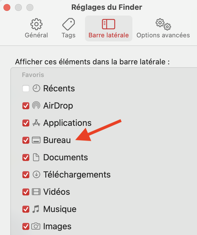 Pour retrouver ton bureau, voici le chemin: "Finder" "Réglages" "Barre latérale"